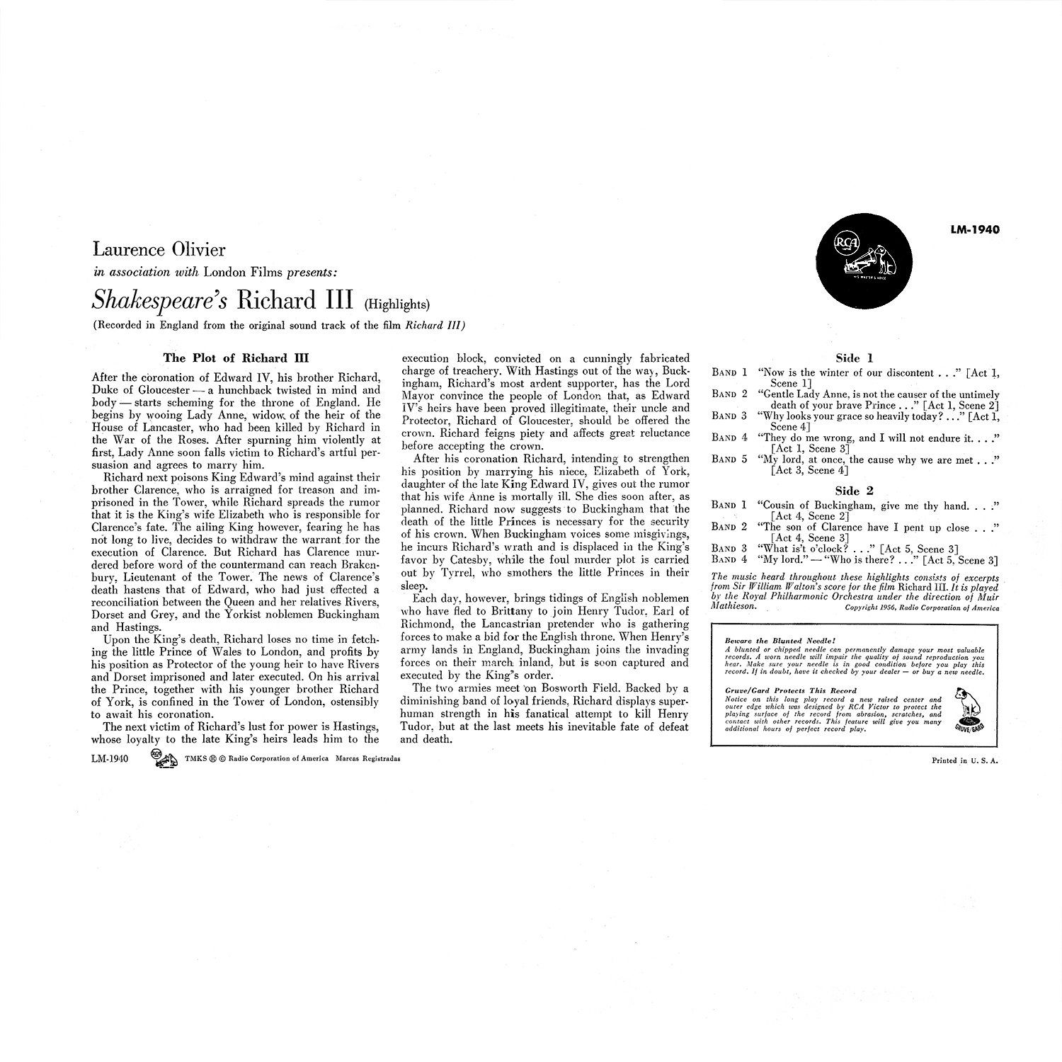 The first showing in this country of Sir Laurence Olivier's production of RICHARD III attracted a great deal of attention, and with justification. It is an impressive spectacle in whatever form it is experienced: on television, on the theater screen in Vistavision and Technicolor, or listening to the soundtrack released by RCA Victor. Sir William Walton wrote the score, as he had for Sir Laurence's previous Shakespearean productions of HENRY V and HAMLET.