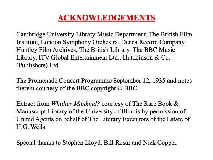 There is much more I would like to share with you about the music to Things to Come, for example, facts about Bliss’s concert suite which changed content between 1935 and 1940. Those of you who attended the 7pm concert yesterday heard Sir Dan Godfrey’s arrangement first published by Chappells in 1936. I have provided summary details about the suite in the Festival Programme booklet. There is also an intriguing letter to explain in which Gordon Jacob confirmed his involvement with the film as a ghost writer. However, time is pressing and I need to conclude.