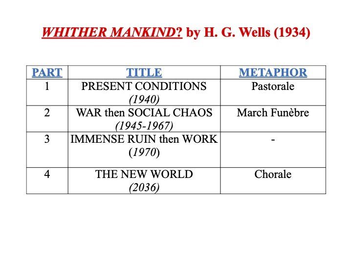 At the outset Wells provided Bliss with a draft film treatment titled WHITHER MANKIND? in which he Wells had defined all the required music cues. The film was structured in four sections with musical metaphors assigned to the parts. SLIDE 4. Part I, PRESENT CONDITIONS, opened in 1940 and had the metaphor ‘Pastorale’; Part II covered universal WAR extending over a 20 year period which then degenerates into SOCIAL CHAOS. This part was likened by Wells to a ‘Funeral March’ ; Part III deals with the prolonged years of RUIN and PESTILENCE followed by the WORK SERIES in which giant machines controlled by scientists create THE NEW WORLD in 2036, 100 years into the future. The metaphor assigned by Wells to Part IV was ‘Chorale’ which I will return to. Interior filming did not start at Elstree Studios until September of 1934 and exterior work on the Denham back-lot took place the following year between March and September 1935.