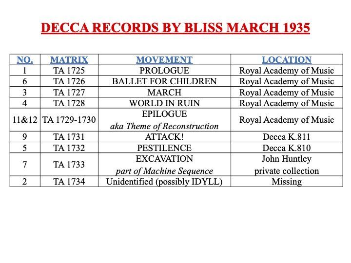 SLIDE 10. The record labels were also marked with a number ranging between 1 and 12 plus the general heading ‘The Shape of Things to Come’. As mentioned, Bliss recorded ten sides in total. So given the numbers range up to 12 it looks like he planned to record two other tracks, numbers 8 and 10. Maybe Bliss simply ran out of time on that day and had to call a halt to the session work. By good fortune six of these ten Decca records surfaced by accident in 1991. They were found in pristine condition and stored in among other shellac records belonging to Sir Henry Wood at the Royal Academy of Music. This enormously valuable find was made by a music student, Jonathan Dobson, who later produced and narrated an excellent radio broadcast for the BBC which aired in 1996 titled ‘More Things to Come’.