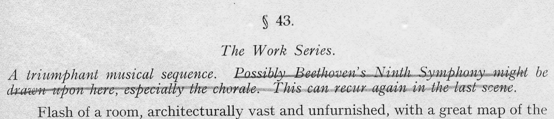 Importantly, the words “Then Epilogue No. 6” have been written in pencil by another person at the end of the manuscript. SLIDE 18. The ‘Epilogue’ features in two places in the film, accompanying the ‘Airmen Landing’ scene at the end of Part 3, which comes just before the ‘Machine Sequence’, and again in Part 4 at the very end, the final scene in the astronomical observatory. ‘No. 9’ written on the front page of the manuscript proves by the way that after editing the film score re-recorded by Muir Mathieson comprised a total of nine movements. If the ‘Idyll’ had been recorded as part of the final soundtrack there would have been ten movements altogether. The numbering found on the surviving manuscript is therefore critical to understanding what score material was used, and not used, by the music director.