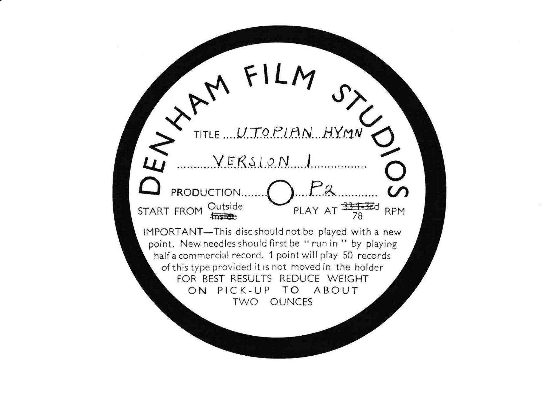 John asked me if I would be interested in material from the film Things to Come. As well as photographs and the first-hand stories told to him by Muir Mathieson, to my amazement he brought out from his archive a collection of shellac records, including a puzzling playback recording made by Denham Film Studios titled ‘Utopian Hymn’. He kindly made a tape cassette recording of all his discs and arranged to have the record labels scanned in high definition. I received this package from him plus a sheet of paper upon which he had written the words: “The Great Mystery Records. Why?” In this talk I will attempt to answer John’s question to me.